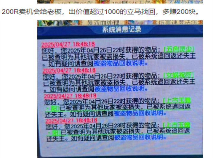 在铸魂任务全服上线以后,梦幻西游中有一部分玩家在出售最后的开上古玉魄的机会,这样能够稳定的获得一定的收益,只是令小编没有想到的是那些买开奖机会的那些老板却被别人给当成了韭菜,因为在现在的梦幻西游中有这样的一批人,他们会将铸魂的开奖机会以200块的价格卖出去。当初的物品的价值在1000以上的时候就会选择立马找回。因为是进行线下交易的原因,这些东西被找回了也没有什么太好的办法,顶多是在线下报警。