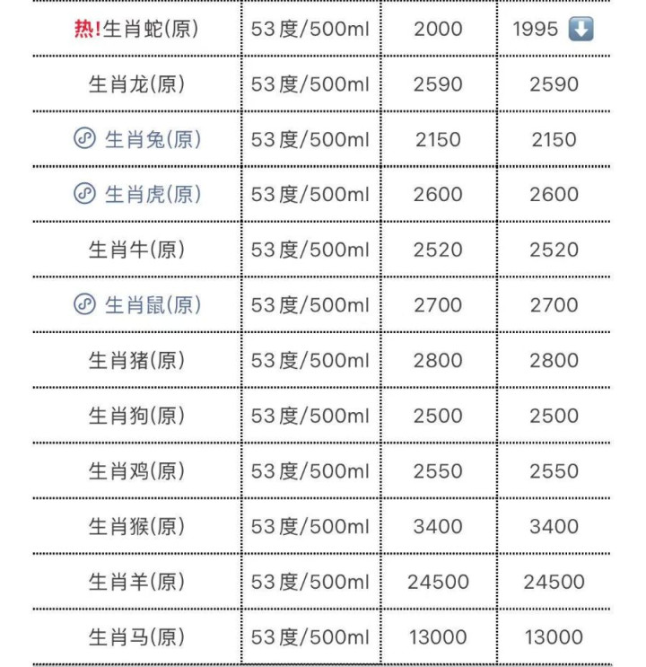 其他茅台生肖酒年内跌幅依次为:“马茅”从15500元回落至13000元,跌幅16.13%;“虎茅”从3050元回落至2600元,跌幅14.75%;“狗茅”从2900元回落2500元,跌幅13.79%;“鼠茅”从3100元回落至2700元,跌幅12.90%;“鸡茅”从2900元2550元,跌幅12.07%;“牛茅”从2850元回落至2520元,跌幅11.57%;“猪茅”从3150元回落至2800元,跌幅11.11%;“猴茅”从3800元回落3400元;跌幅10.53%。